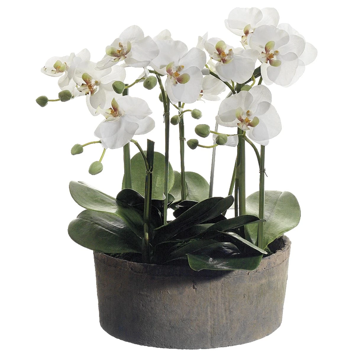 Add the exotic elegance of this 19 inch Phalaenopsis Orchid Plant in a Clay Pot to your home or office. The rustic sophistication of the round clay pot is the perfect backdrop for the chic sophistication of the polyester silk flowers themselves. This all-season indoor arrangement works well with nearly any decorating style.