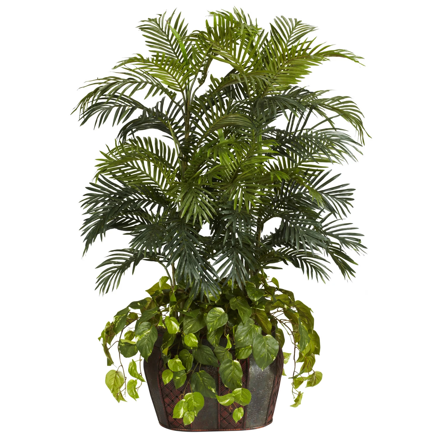 What a great design of varied plants coming together to create something more beautiful than they ever could by themselves. Our Double Areca with Vase and Pothos is a rich collection of very different plants. Over four feet high, the Areca burst through an overflow of Pothos to create a water-like effect anywhere you wish to display it. Comes in a deep brown vase inspired by traditional tropical island art.