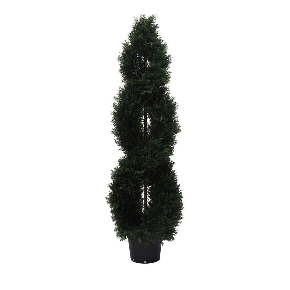 The 5 foot Cedar Double Spiral Topiary is a perfect choice for adding natural looking privacy in your yard or around a porch. This artificial topiary gives you unique, styled greenery without the constant trimming.