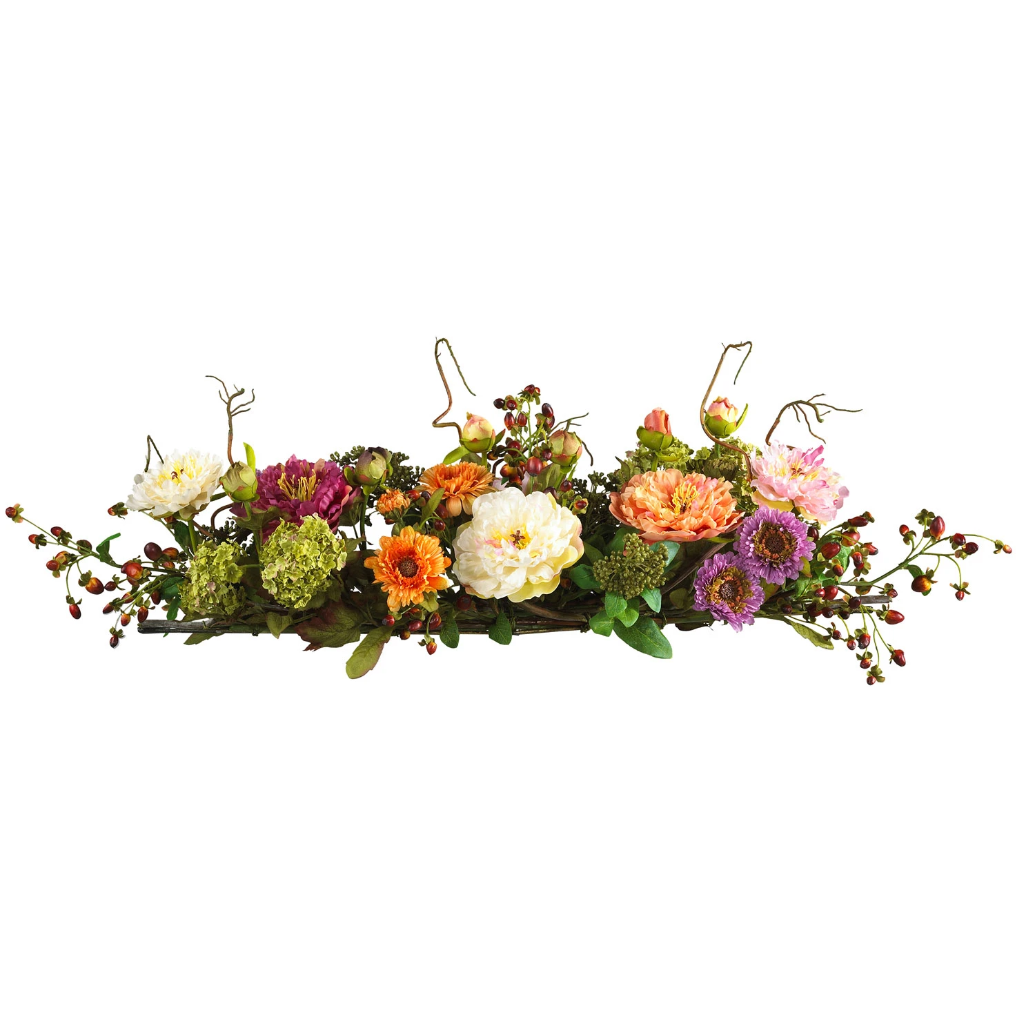 A colorful addition to any room, this dazzling peony arrangement will have you dreaming of a sunny spring day no matter what the season. Plush pastel petals are flanked by a crisp mix of delicate buds and foliage. Nearly three feet in length, it’s the perfect size to compliment a dining room table or fireplace mantel. Perched gracefully atop rustic intertwined twigs, you’ll be impressed with its authentic beauty. This item is pre-made and can not be altered.