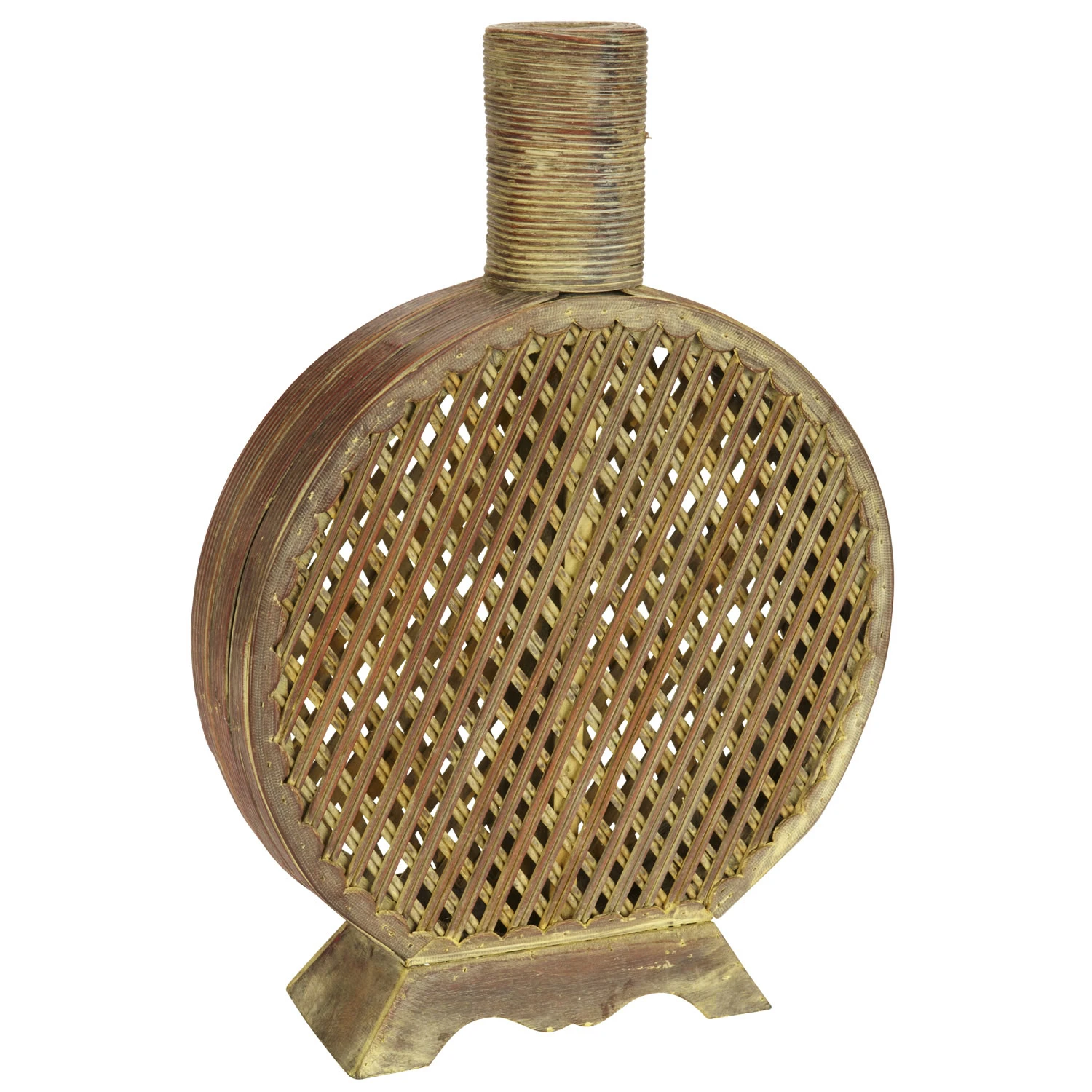Arguably one of our more interesting looking pieces, this flask shaped vase is decorated with a tan and gold finish to create an old fashioned look (while being very modern). Sitting on an outward rectangular base for stability, the see-though cross hatching creates an interesting pattern of shadow and light while the top draws attention to any Nearly Natural foliage you set inside. It also looks great solo.