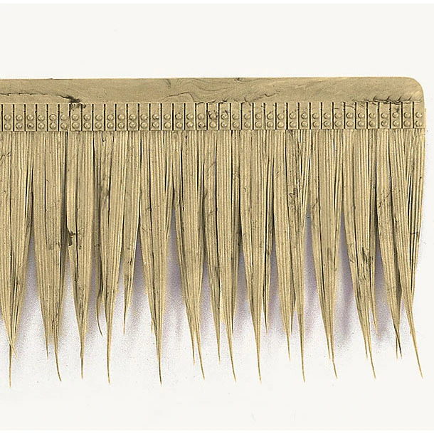 Artificial Thatch is designed for outdoor and indoor use. It is 100% synthetic, flexible and easy to install. Our outdoor artificial thatch shingle provides instant tropical flare for tiki bars, cottages, and umbrella covers. Our polyblend thatch will last many years and eliminate the problems associated with natural thatch. It will not rot, mold, or look unsightly. We also carry this thatch in a inherently fire retardant version.